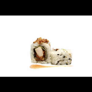 Uramaki a base di pollo fritto,insalata,maionese con sopra cipolla croccante e salsa agropiccante