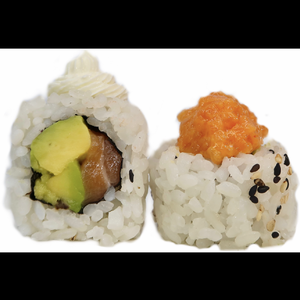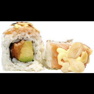 Roll da 8pezzi con tartar di salmone e avocado con sopra scaglie di mandarle e salmone scottato ricoperto dalla salsa speciale dello chef e teriyaki