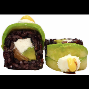 Roll da 8p a base di riso venere con all’interno salmone,avocado,Philadelphia ricoperto da una scaglie di avocado e mango a spicchi con sopra salsa mango e teriyaki